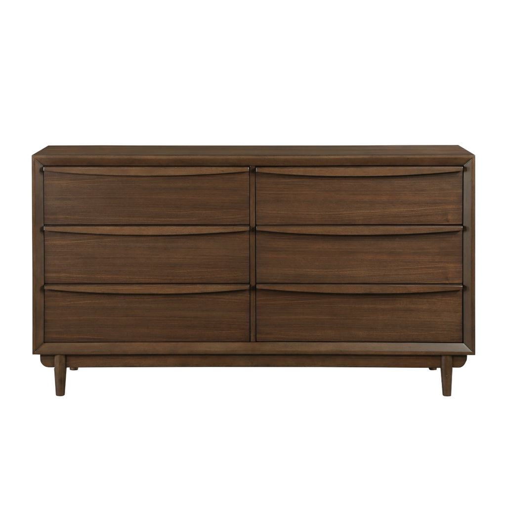 In a new take on Mid-Century Modern-inspired design, the Astrid Collection lends its deceptively understated bold look and creates an aesthetic that is both artful and timeless. A walnut finish is utilized over walnut veneer to solidify the classic style. The design of the framed-edge platform bed features clean lines and is complemented by the dark gray textured fabric that covers the padded headboard panels. The dresser, nightstand, and chest each feature wood drawer pulls that fully span the face of the drawers; their presence encompassed in the overall design of each piece. USB charging ports are mounted on the nightstand for convenient access to your electronic devices while both you and they recharge.