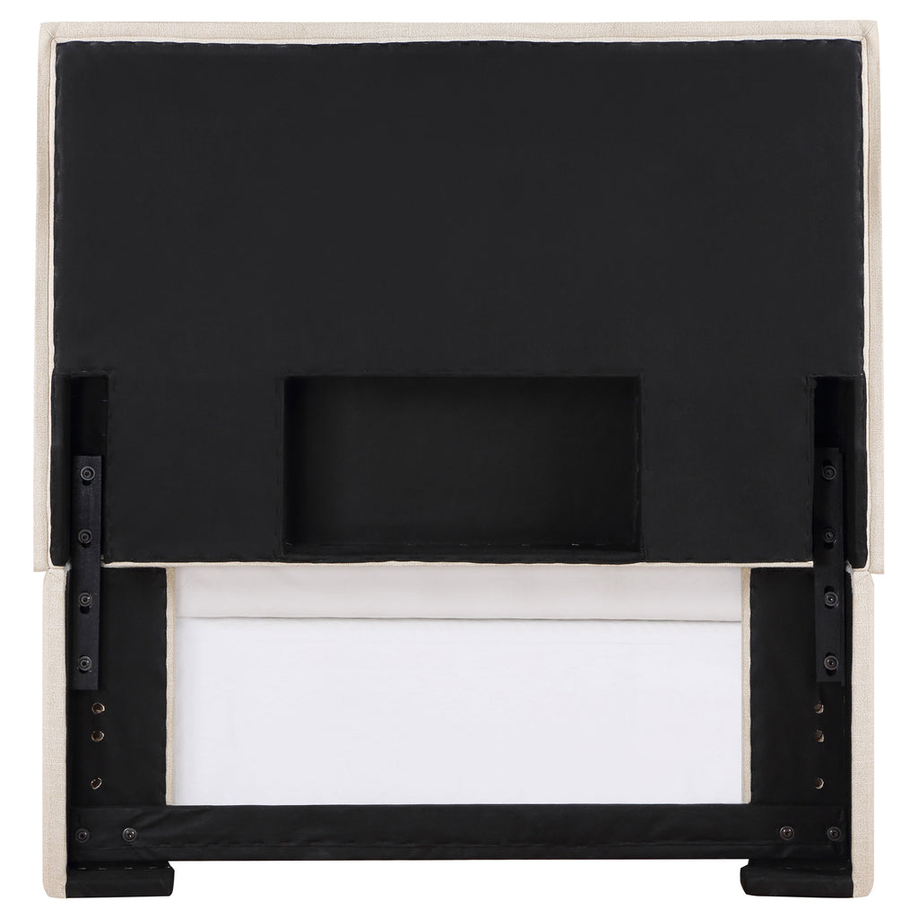 Inspire modern artistry in a contemporary bedroom space with a headboard that shines as a focal point. This updated headboard creates a mix of clean lines and tempting upgrades to transform a bedroom into a haven for relaxation. Versatile and timeless, flange details dress up the outer border, adding a dimensional effect. Textured sand finish fabric wraps over the headboard to deliver a light essence and a palette that accommodates a variety of options for matching case pieces, beds, and accessories. Constructed of pine wood.