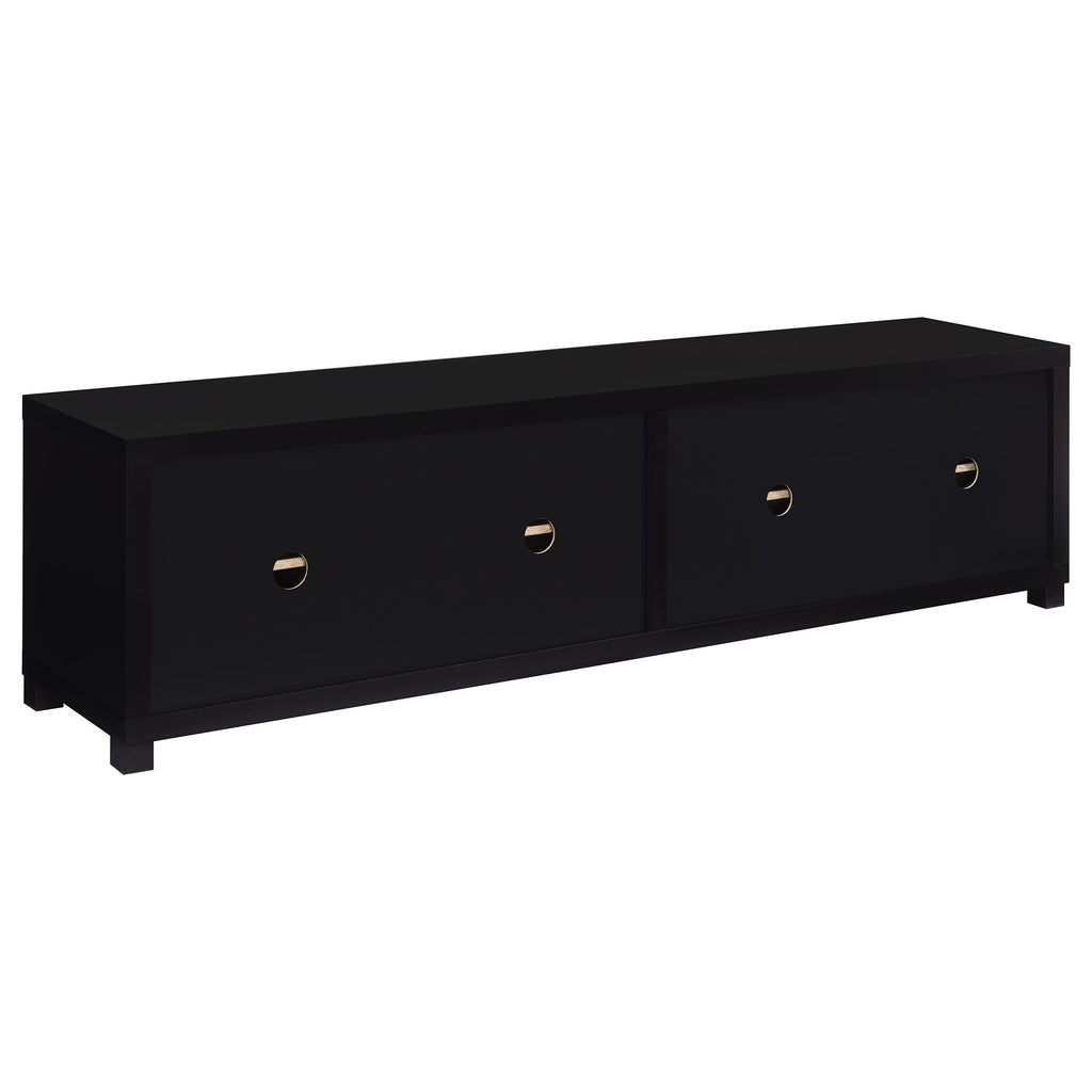 Transform your living room into the ultimate entertainment hub with this sophisticated three-piece entertainment center. Anchored by a commanding 79-inch TV stand, this set is designed to accommodate up to an 85-inch television, bringing a cinematic experience right into your home. The TV stand features four doors that open to adjustable shelves, perfect for organizing your media devices, gaming consoles, and more. Flanking the TV stand, two sleek media towers offer additional storage and display options, with open shelving for your favorite books and decor, and a concealed cabinet for hidden storage. Finished in a striking black hue, this entertainment center blends modern elegance with functional design, creating a seamless and stylish focal point in your living space.