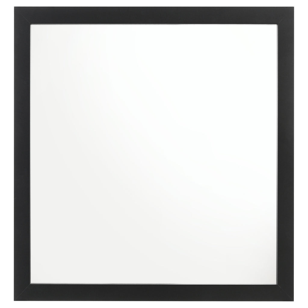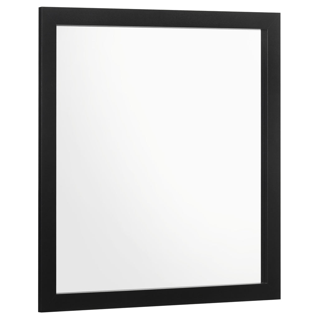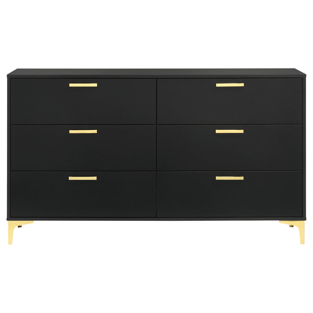 Introduce a touch of glamour to your master or guest suite with the impeccable design of a modern four-piece wingback bedroom set. Black upholstery matches a black case finish, with a nightstand and dresser with a mirror providing plenty of storage for personal items, clothing and accessories. The set centers on a sophisticated bed design, complete with a tall wingback headboard studded with golden rays that provide verticality and gleaming contrast. Matching bracket feet complete each piece, creating a bold sense of contrast and depth that anchors a glamorous bedroom setting. Add linens and lighting to create the perfect look for your space.