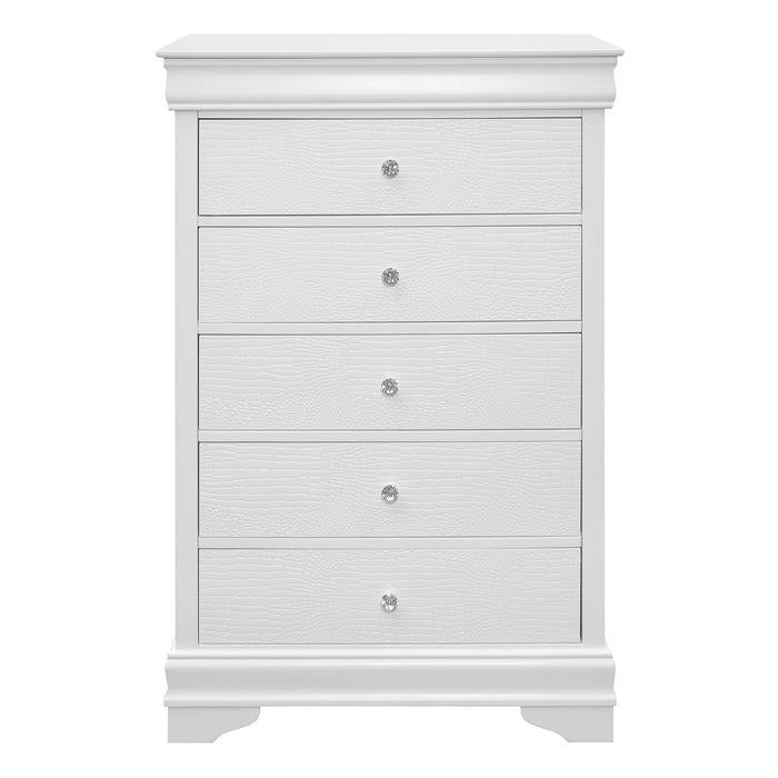 The unexpected intersection of traditional design and glamorous styling creates the dynamic look of the Lana Collection. A white finish is utilized to enhance the faux alligator embossed drawer fronts of the chest with crystal faceted knob hardware lending an additional fabulous touch. The chest features hidden storage allowing for the discrete placement of your personal affects. 32 x 17.5 x 47.5H