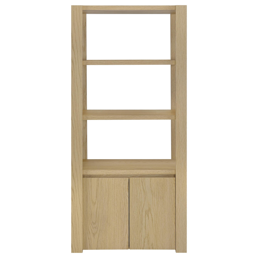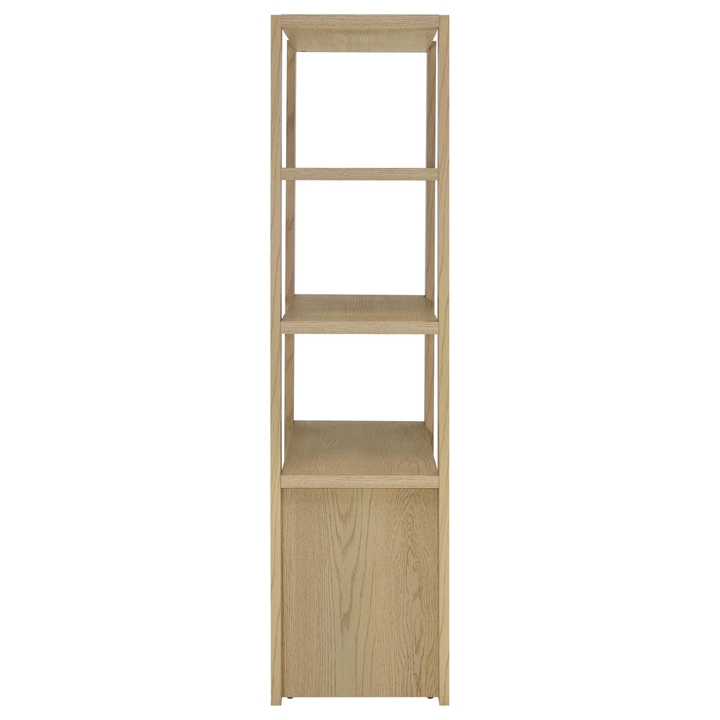 This tall media tower invites serene sophistication with its airy silhouette and thoughtful design. Three open shelves offer a stage for cherished décor, while two lower doors conceal an adjustable shelf for curated storage. A discreet cord cutout ensures seamless connectivity. Crafted from engineered wood with a scratch-resistant and eco-friendly laminate veneer, its light oak finish brings organic warmth to any living room, media center, or entertainment corner. Key Features: • Media tower with open design and closed cabinet in a serene light oak woodgrain finish • Light oak tone enhances the natural character with warmth and understated charm • Three wide shelves showcase books, keepsakes, or audio-visual essentials • Two doors reveal a spacious cabinet with one adjustable shelf for hidden storage • Rear cord cutout keeps electronics connected while maintaining a clean profile • Crafted from engineered wood with a durable, eco-friendly laminate veneer