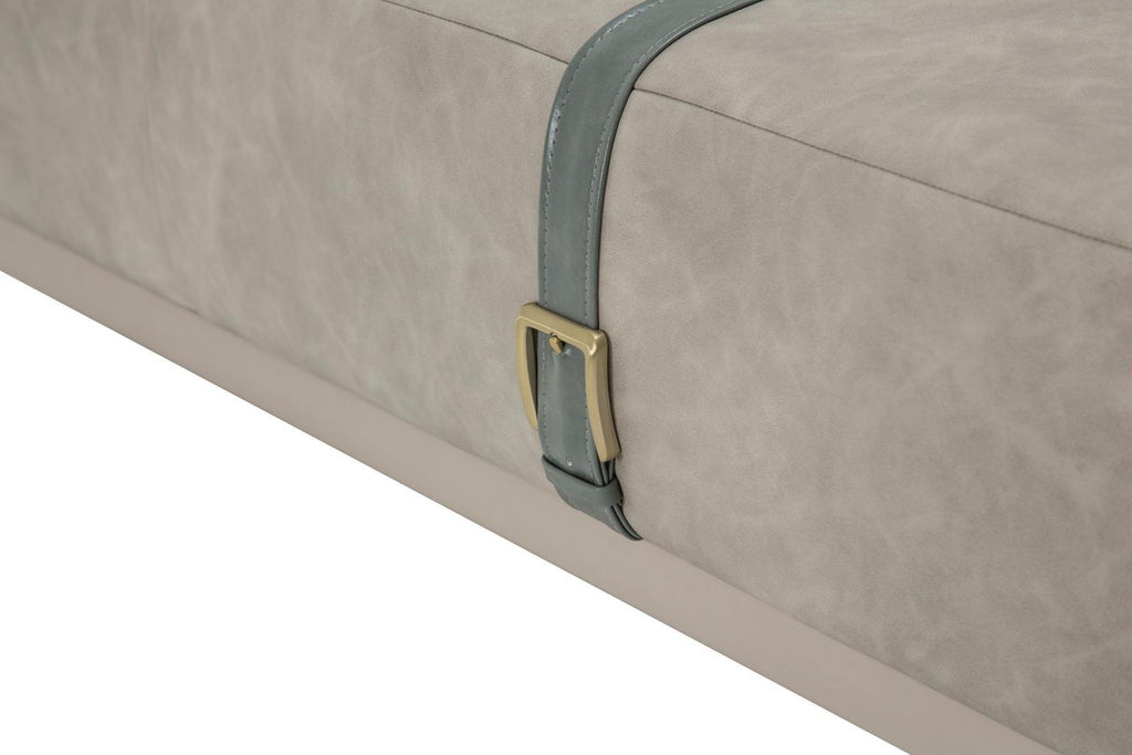 - Distressed gray vinyl upholstery over a firm cushion top
