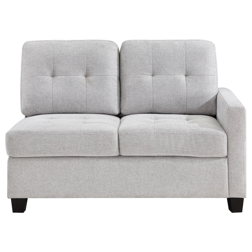 Complete your sectional setup with this right arm facing (RAF) loveseat, designed to add both style and functionality to your living space. The loveseat is upholstered in a refined fabric that pairs well with a variety of decor styles, making it a versatile addition to your home. Foam-padded cushions offer plush comfort, while the sturdy wood frame ensures durability and support. The right armrest design is perfect for creating a finished look in your sectional arrangement. Subtle tufting on the back cushion and chunky wood feet contribute to the chair’s timeless design, making it a stylish and comfortable choice for any room.