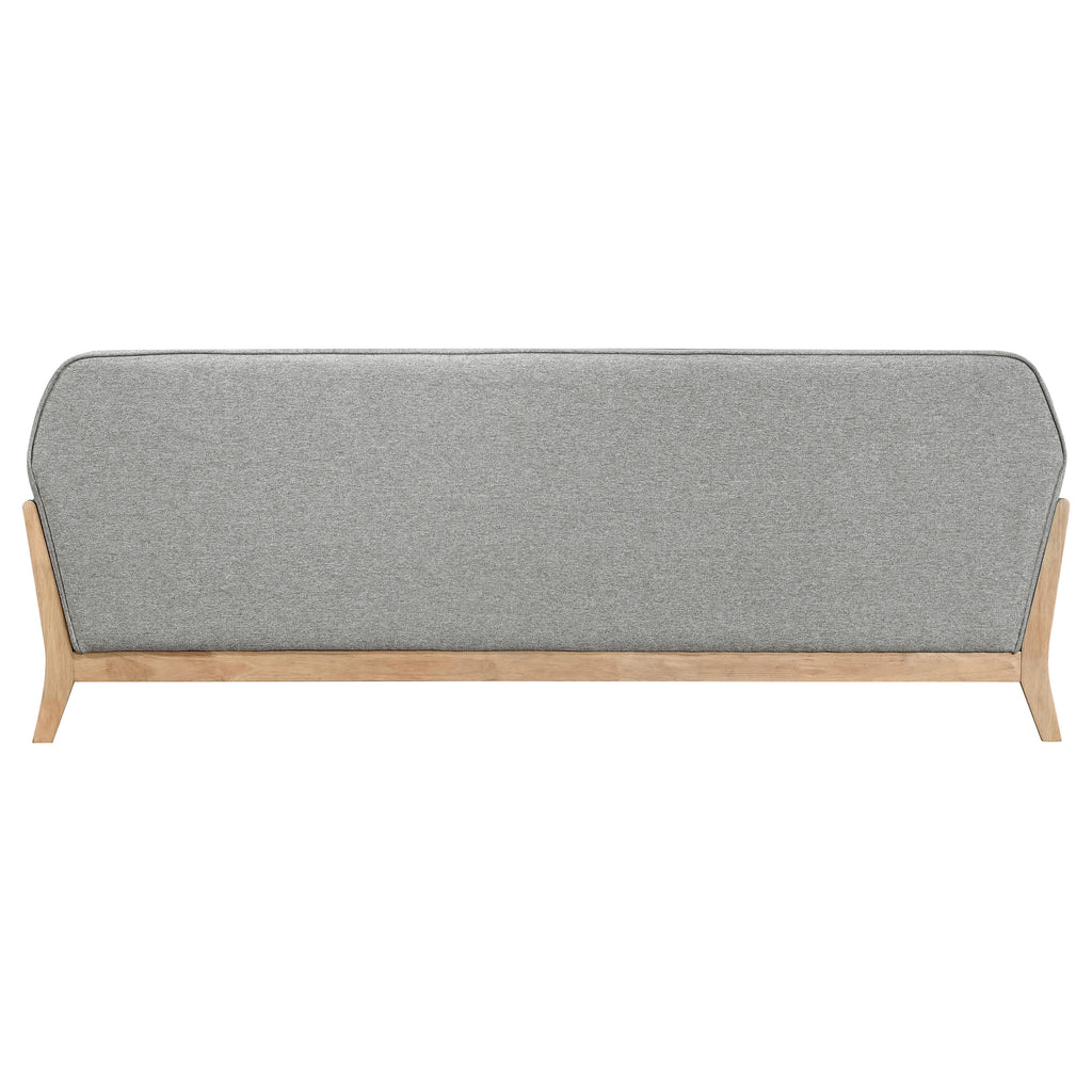 A seamless fusion of modern curves and vintage roots, this sofa lends refined presence to any space. Flared arms and a smooth, contoured backrest exude retro charm, while plush cushions offer an inviting retreat. A light-toned wood frame crafted from solid rubberwood surrounds the base in sculptural support. Upholstered in soft polyester fabric, this tailored sofa balances comfort and design for stylish lounging in living rooms or cozy nooks. Key Features: • Sofa with flared arms and contoured backrest adds tailored retro character • Blonde wood finish enhances open frame with a light and airy presence • Flared arms taper smoothly into gently arched backrest for visual flow • Plush foam seat cushions provide cozy lounging for everyday comfort • Upholstered in soft grey polyester fabric for durability and sleek texture • Framed in solid rubberwood for strength with a sculptural design appeal