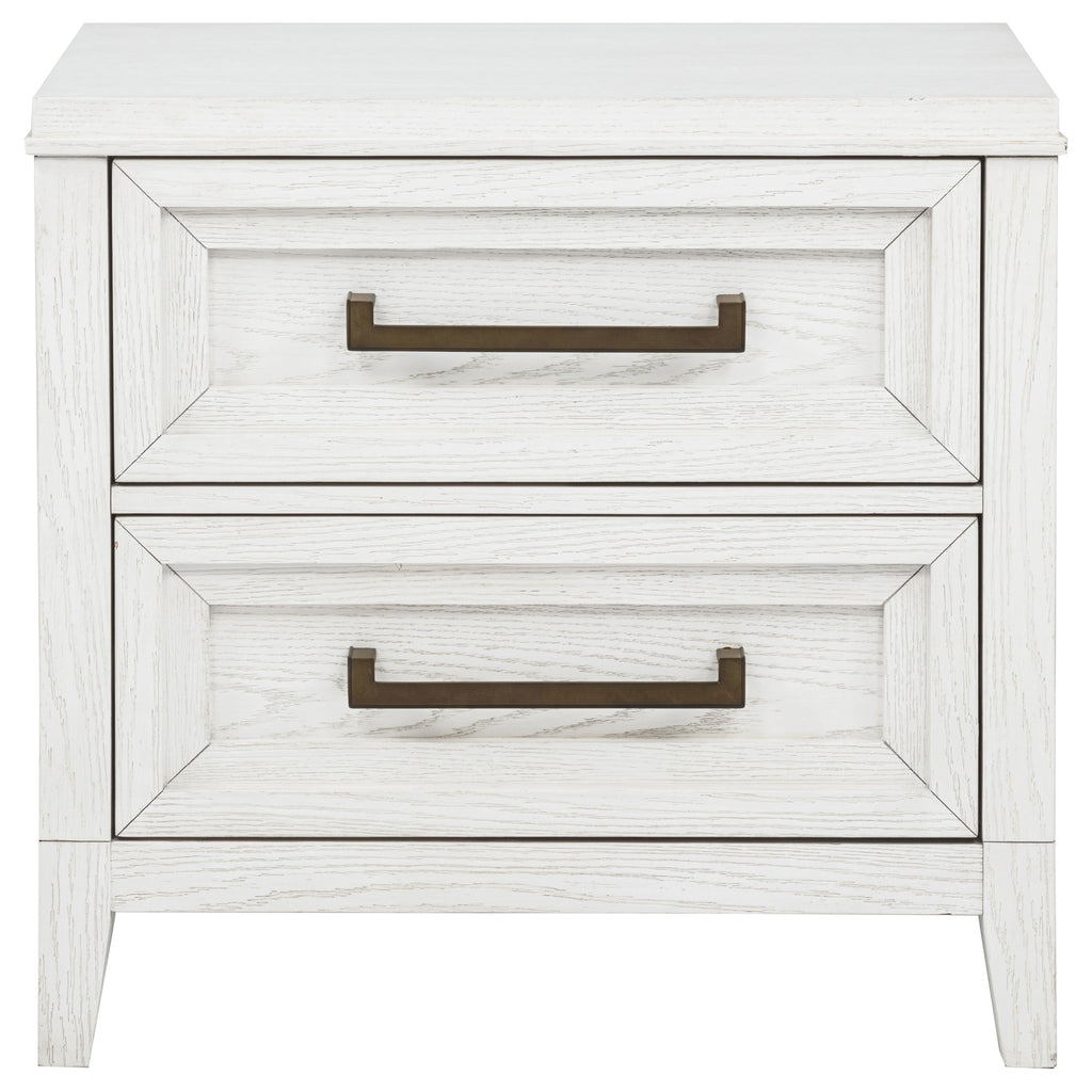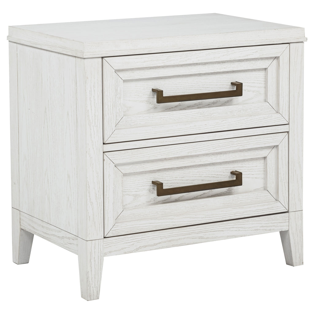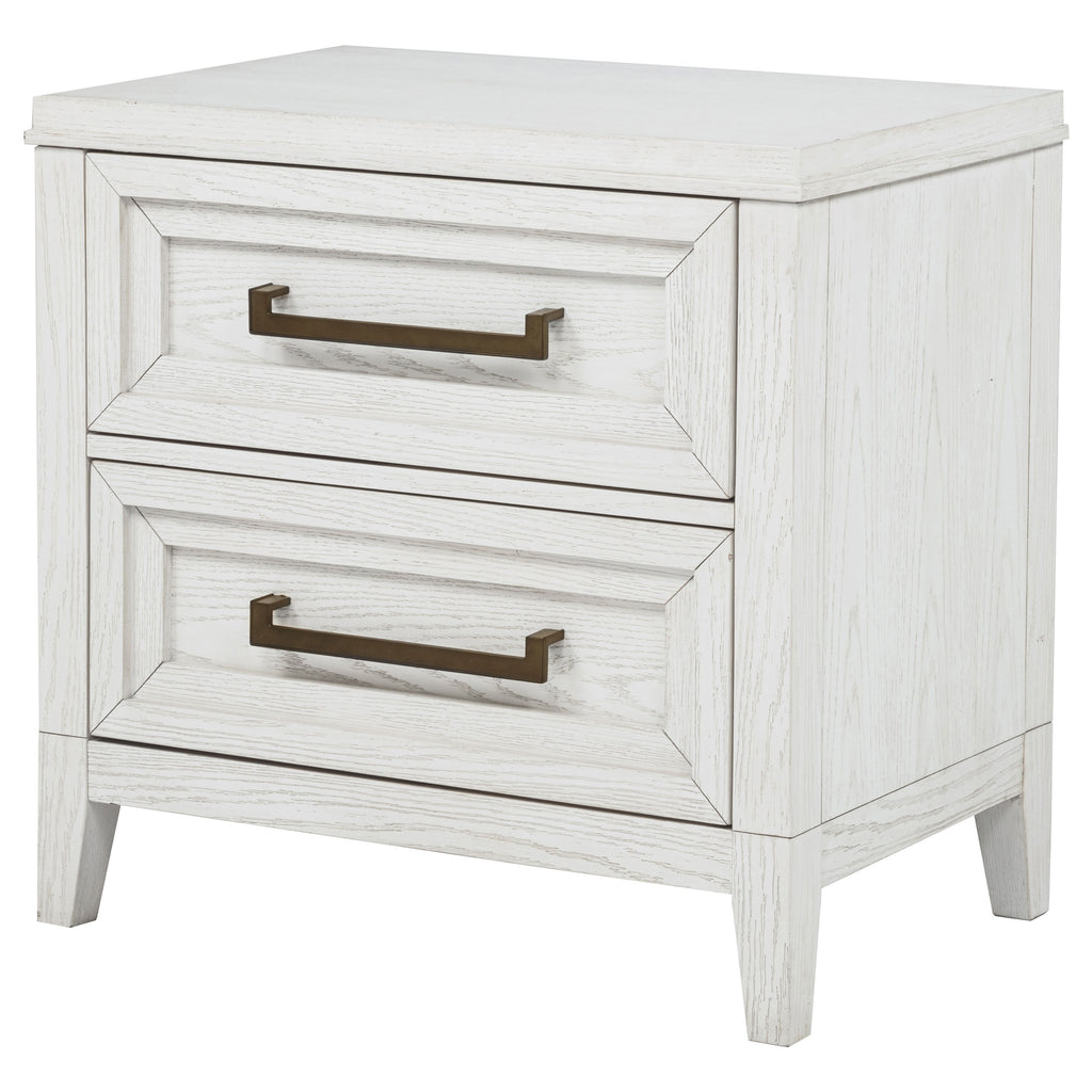 Bring fresh perspective to your bedside with a modern two-drawer nightstand. Its casual style and classic stance create a restrained look and feel, perfect for a soothing bedroom space. It features a distressed white finish over wood grain, creating subtle depth and detail. Drawers are roomy for bedside essentials, and stepped fronts add character and dimensionality. Contrasting antique brass toned bar pull complete the look, offering stylish allure in your stylish bedroom.