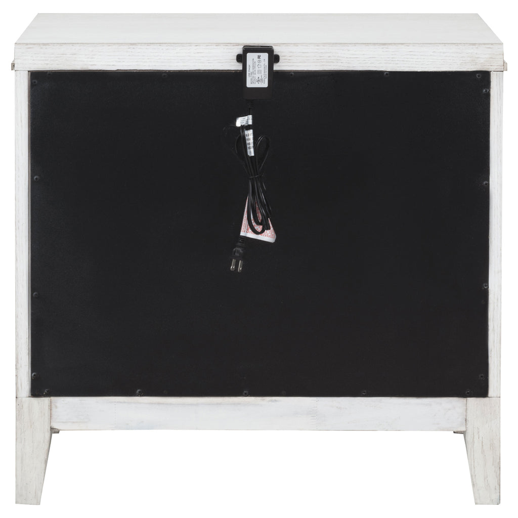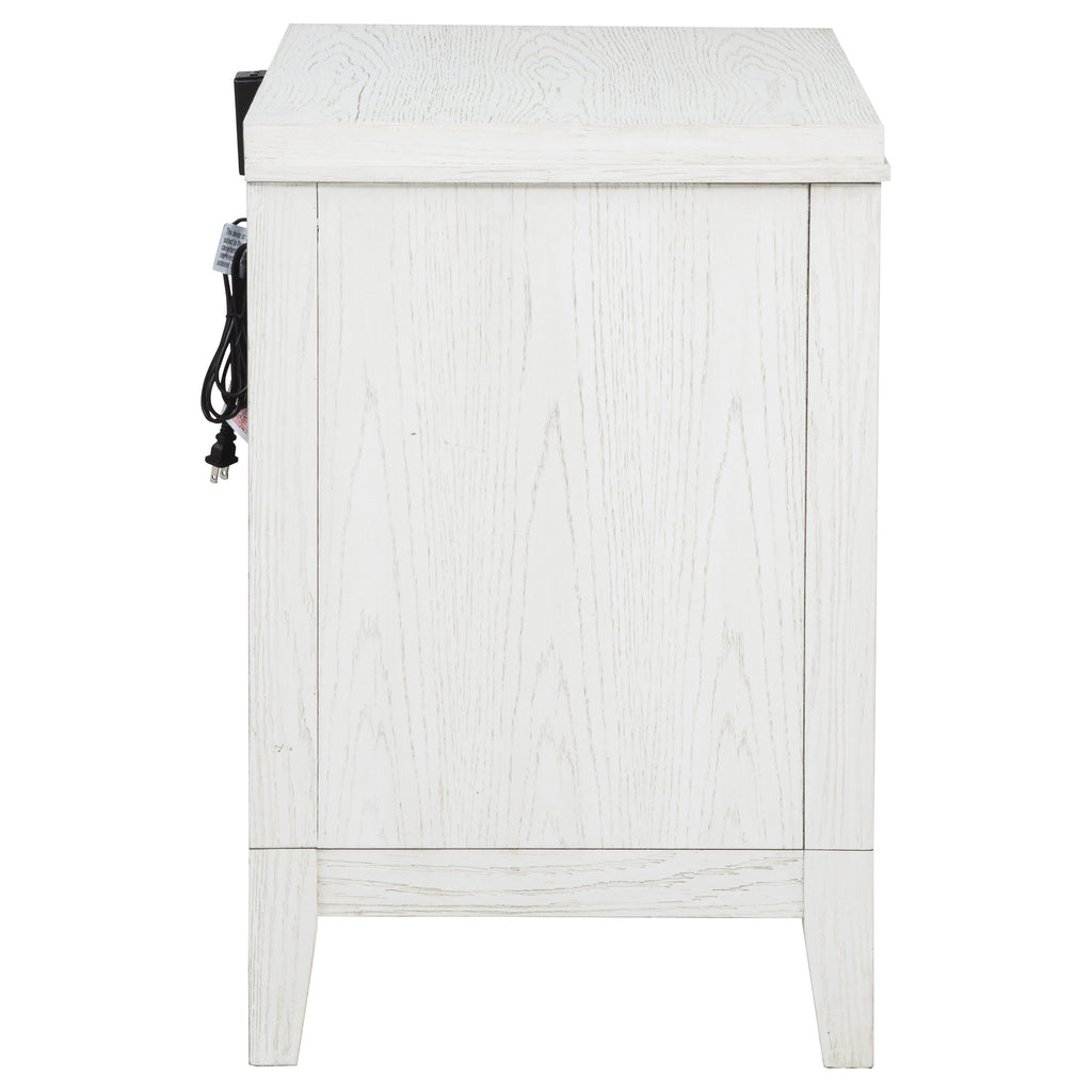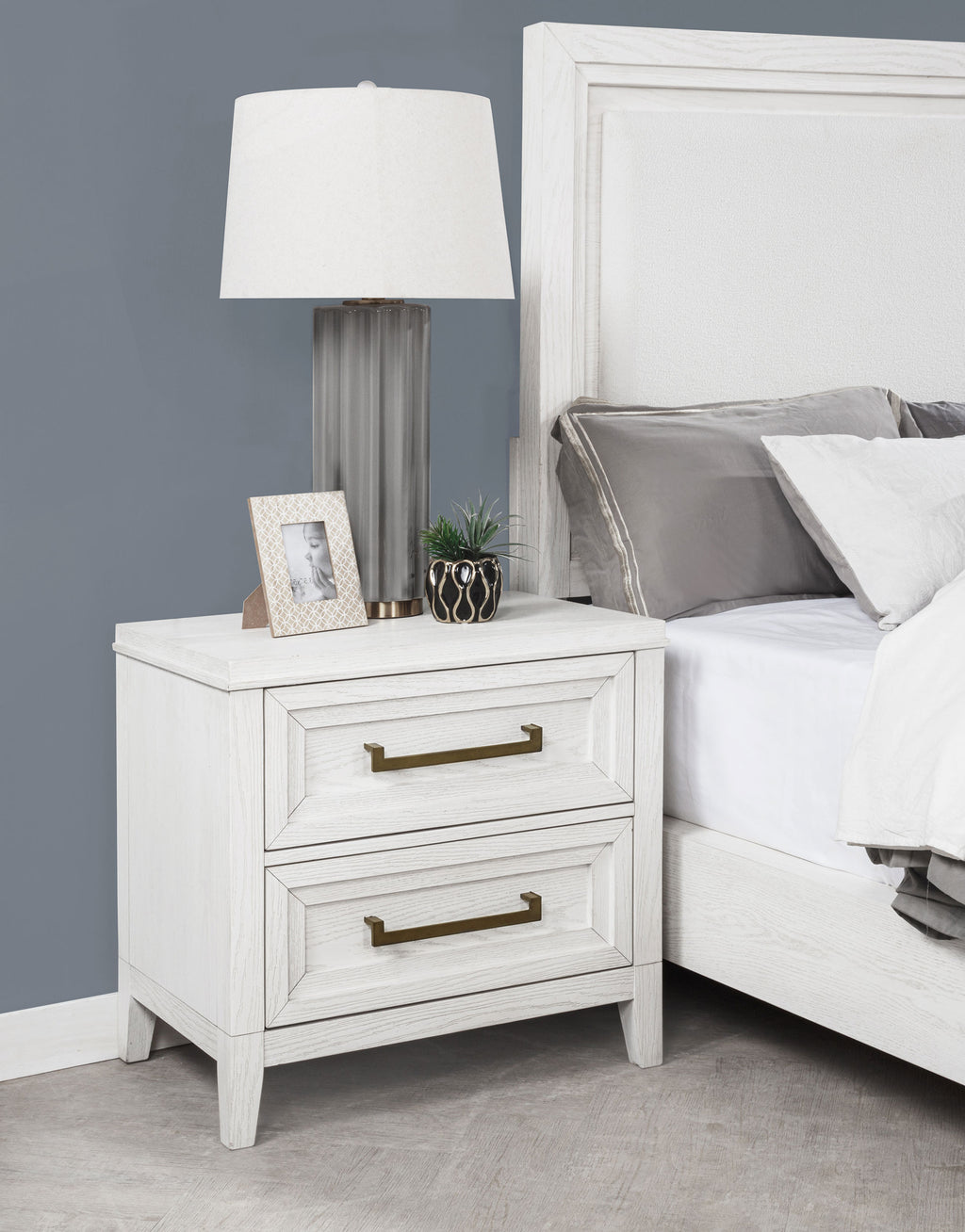 Bring fresh perspective to your bedside with a modern two-drawer nightstand. Its casual style and classic stance create a restrained look and feel, perfect for a soothing bedroom space. It features a distressed white finish over wood grain, creating subtle depth and detail. Drawers are roomy for bedside essentials, and stepped fronts add character and dimensionality. Contrasting antique brass toned bar pull complete the look, offering stylish allure in your stylish bedroom.