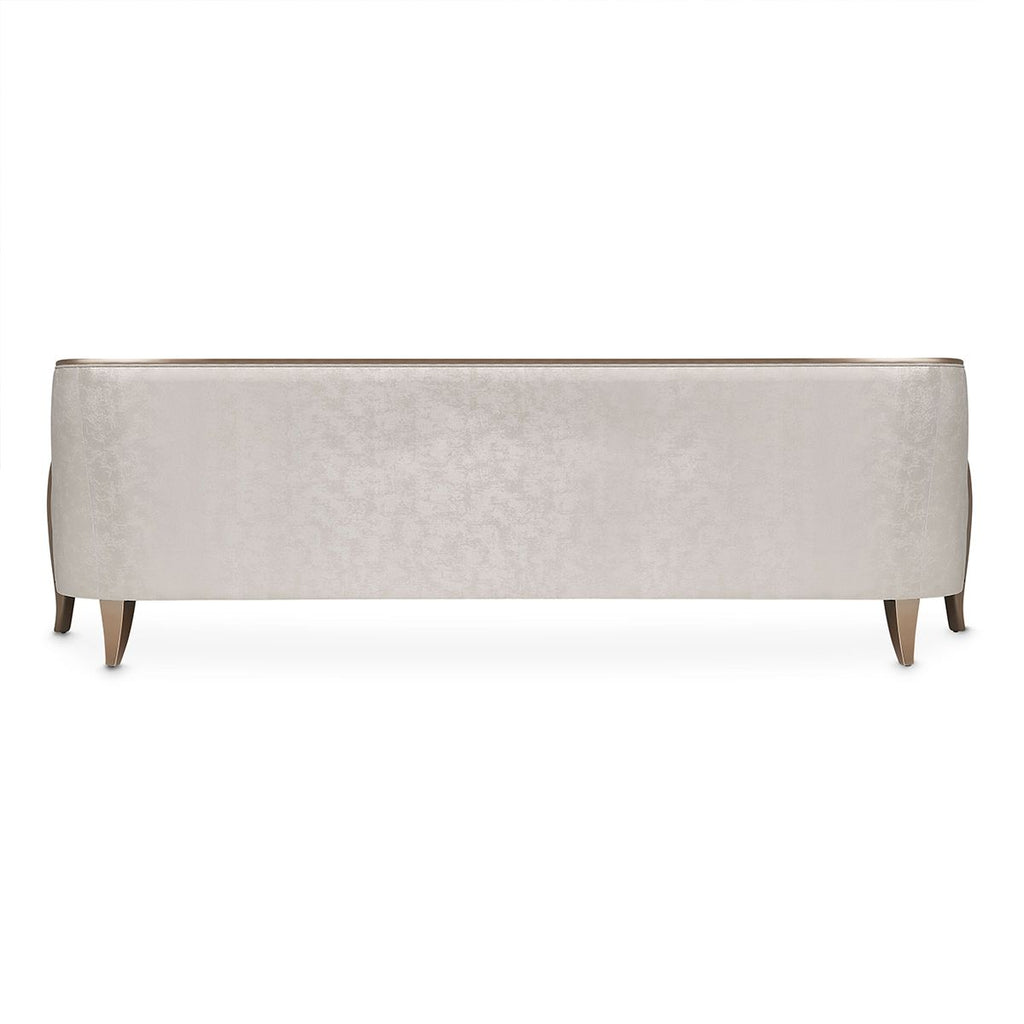 AICO Malibu Crest Sofa in Chardonnay N9007816-CLDWH-822. Design your home for romance. The Malibu Crest Sofa features an exquisitely curved body, V-notch arms finished in Chardonnay, and a softly textured seat certain to brighten your home atmosphere instantly!