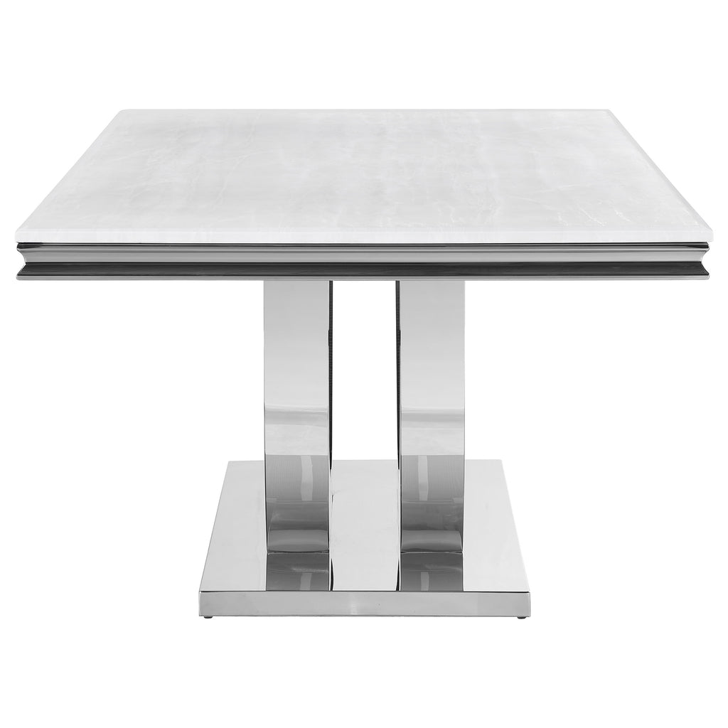 Host family and friends around this sleek, modern glam dining table for an elevated dining experience. Designed with an open demilune pedestal base in a lustrous polished chrome finish, this magnificent, rectangular dining table lends a luxurious look and feel to your space. A spacious tabletop is covered in a white marble paper and features a beveled edge that offers a timeless contemporary touch. The open pedestal base rests on a slim flush base that offers extra stability and a seamless expression. Seat six guests comfortably at this sophisticated dining table.