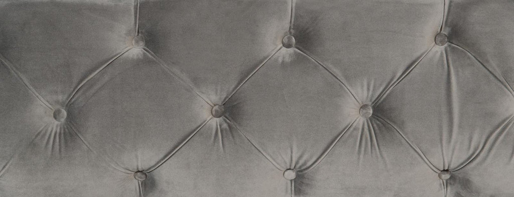 • Gray velvet-covered, rolled, padded headboard and footboard