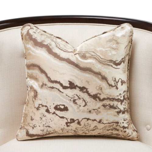 AICO Furniture Belmont Place Accent Chair in Espresso 9085834-CREAM-409. The Belmont Place Accent Chair is a masterpiece of elegant curves and refined detailing. Wrapped in a linen-like, stain-resistant fabric, the plush seat and back offer comfort and style. The rich espresso frame gracefully sweeps around the chair, highlighting the exquisite marbleized accent pillow and gold-tipped legs, creating a statement piece that's both contemporary and timeless.