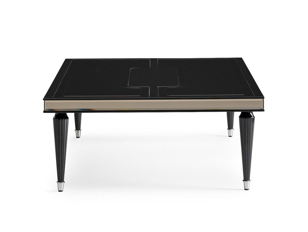 AICO La Francaise Cocktail Table in Black Ice LFR-FRSE201-805. Finished in a striking reflective hue, this modern table is adorned with a mirrored top and edges that effortlessly catch the eye. Enhance your living space with the sophisticated charm of this stunning cocktail table, designed to create an ambiance of refined elegance and contemporary flair.