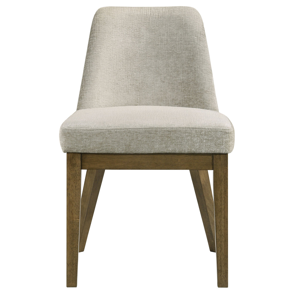Upgrade to the inviting ambiance of this modern wooden dining set that includes a rectangular table and side chairs. It creates a warm and welcoming ambiance in your dining room, featuring a brown oak wood grain finish that pairs beautifully with light tan upholstery. Chairs feature foam cushions and a robust wood base design, augmented with tapering legs that provide ample support. The rectangular dining table features round column legs with rounded corners to create a seamless, cohesive look and feel. Choose a stylish centerpiece or lovely linens to complete the look.
