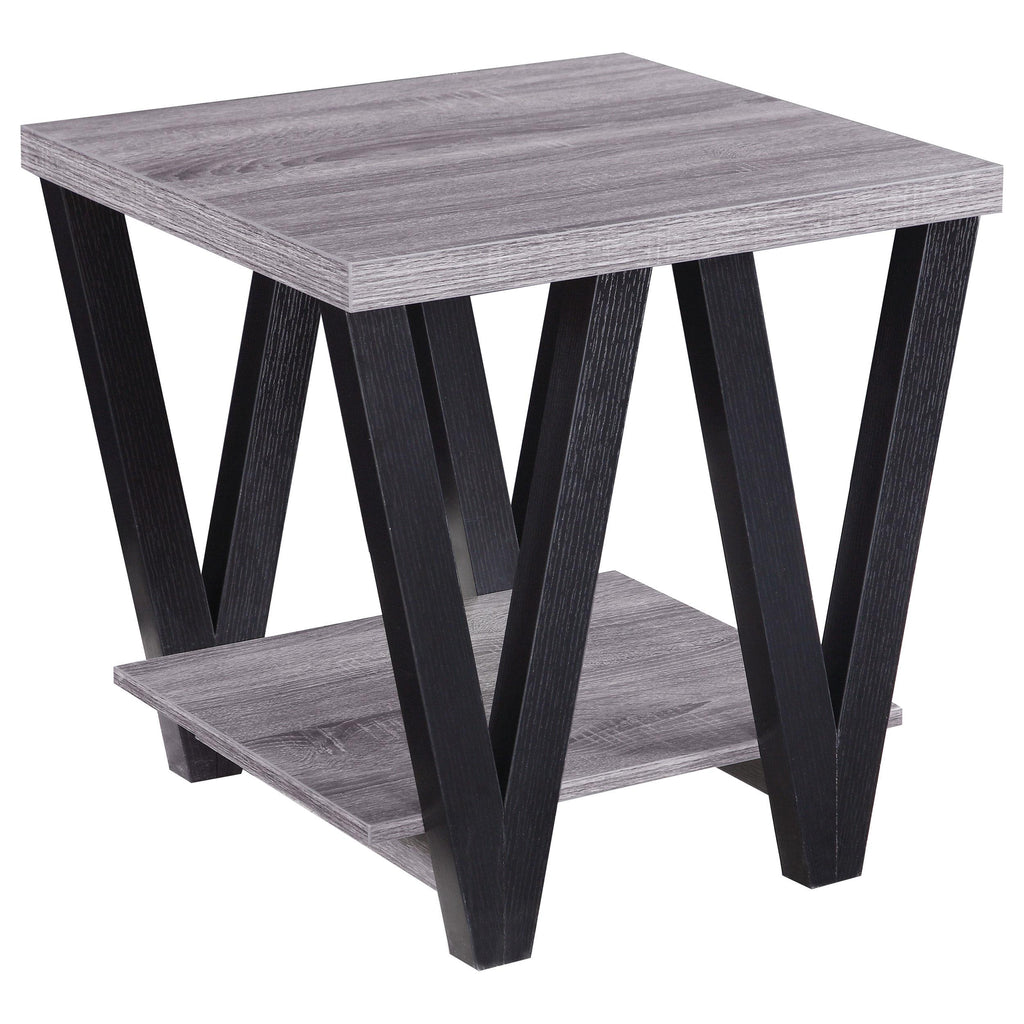 This modern end table combines style and functionality, perfect for contemporary living spaces. The square grey wood-look top and lower shelf, crafted from engineered wood with a durable laminate veneer, provide ample surface area and storage. Black "V"-shaped legs offer striking visual contrast and robust support. Its compact size and additional storage shelf make this side table a practical and elegant choice for your living room or seating area.