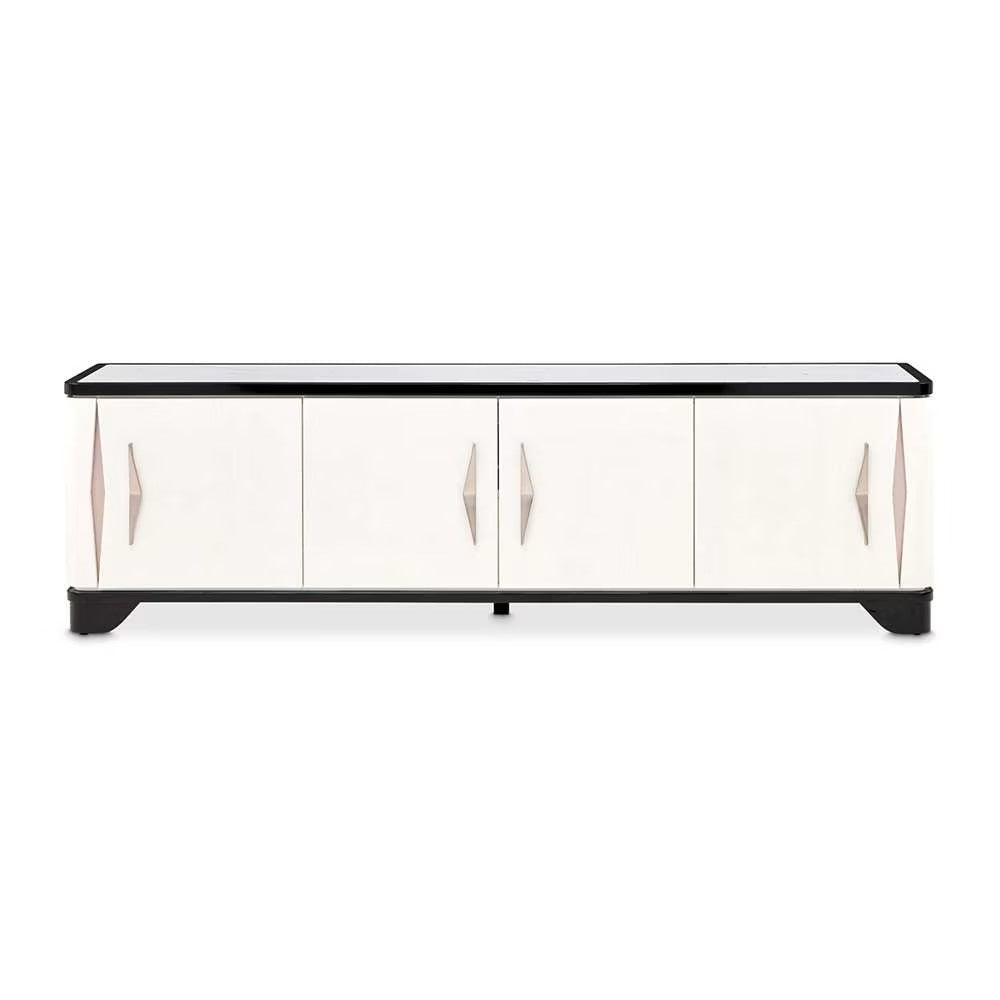 AICO Furniture Tuxedo Media Cabinet in Piano Keyboard 9087081-832. Integrate functional elegance into your living space with the Tuxedo Media Cabinet. This sophisticated piece is crowned with a luxurious marble inlay that adds a touch of opulence to its sleek design. The cabinet features internal adjustable shelving, offering customizable storage solutions for all your entertainment essentials. Additionally, strategically placed grommets for cables ensure your setup remains neat and accessible.