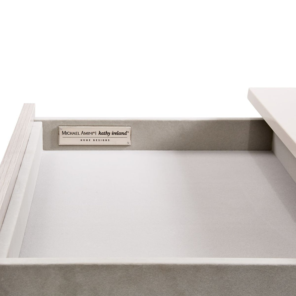 AICO Marin Nightstand in Greige KI-MRIN040R-139. The Marin nightstand is simple yet elegant with its cultured marble top and stainless-steel accents. The three velvet lined drawers with self-closing glides are the perfect place for convenient bedside storage.