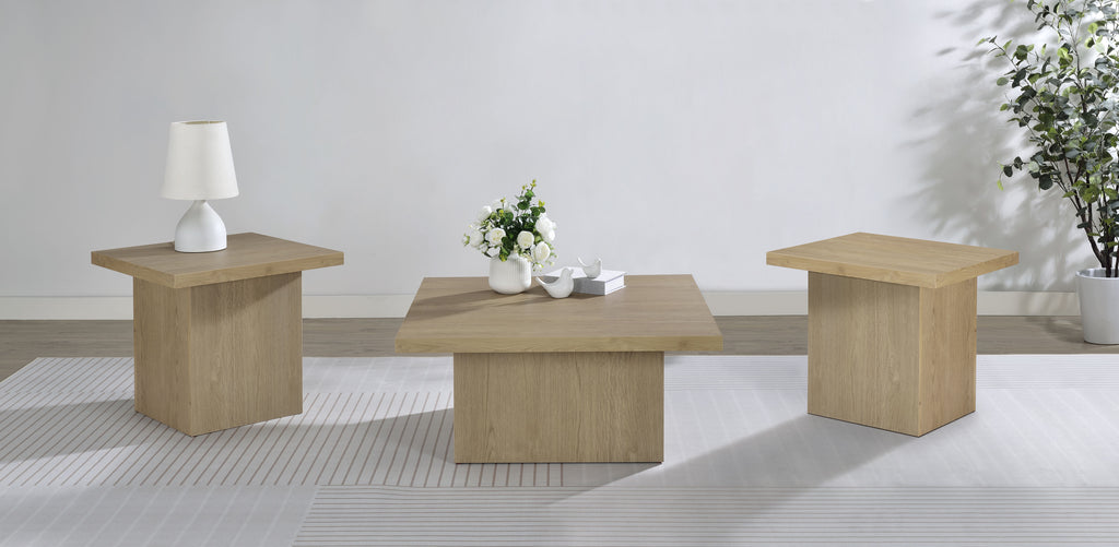 This coffee table set combines the natural beauty of engineered wood with a rustic mango finish. The sleek, square tables feature clean lines and oversized block bases, providing a sturdy and stylish design that enhances casual living spaces. The laminate veneer offers a wood grain appearance, reflecting an earthy, organic vibe that works well in relaxed, contemporary rooms. These occasional tables are ideal for creating a cohesive and functional centerpiece in your living area. Key Features: • Coffee table set made from engineered wood with laminate veneer for durability • Features a natural mango wood look with grain markings for a rustic touch • Spacious square tops offer ample surface area for decor or everyday items • Oversized block bases provide a stable, grounded design • Eco-friendly laminate veneer offers a scratch-resistant surface for easy care • Versatile design works well in both standalone and paired configurations