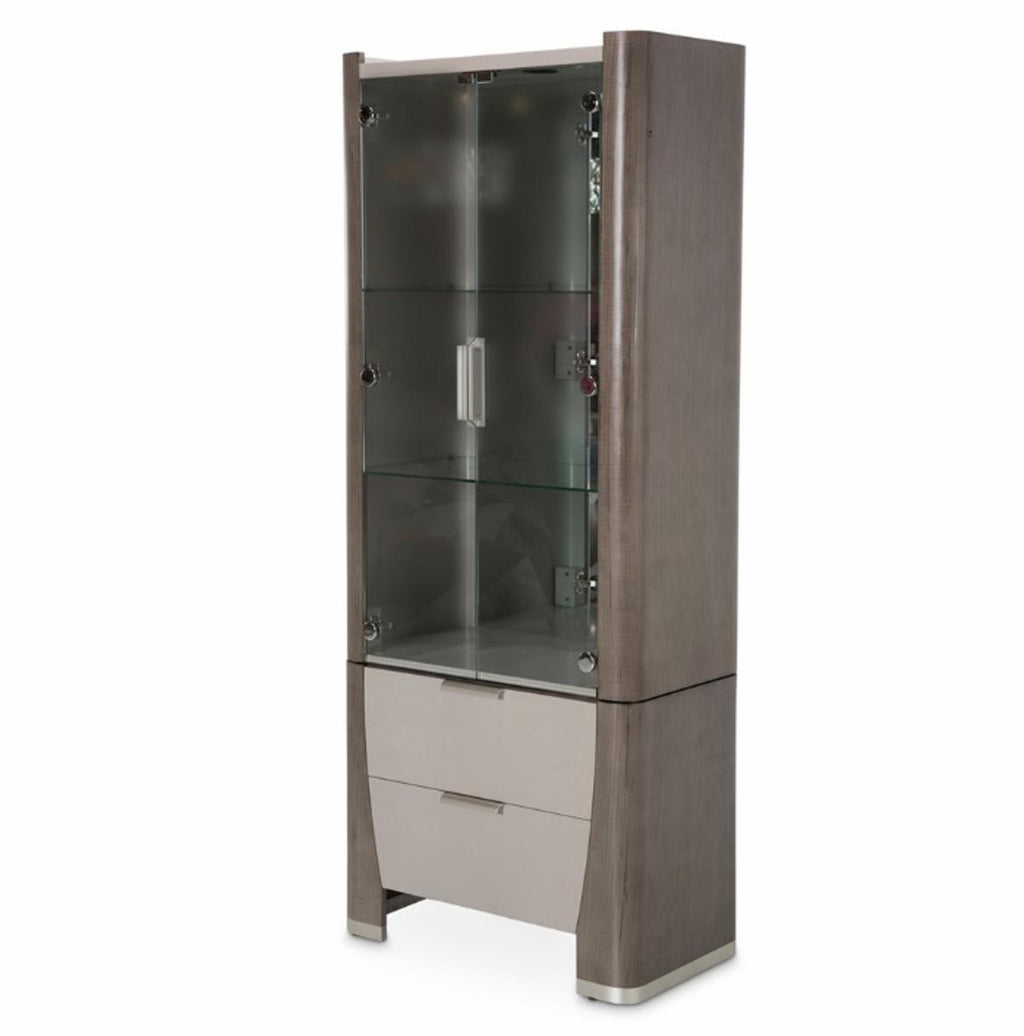 - Drawer fronts are wrapped in frost gray faux shagreen