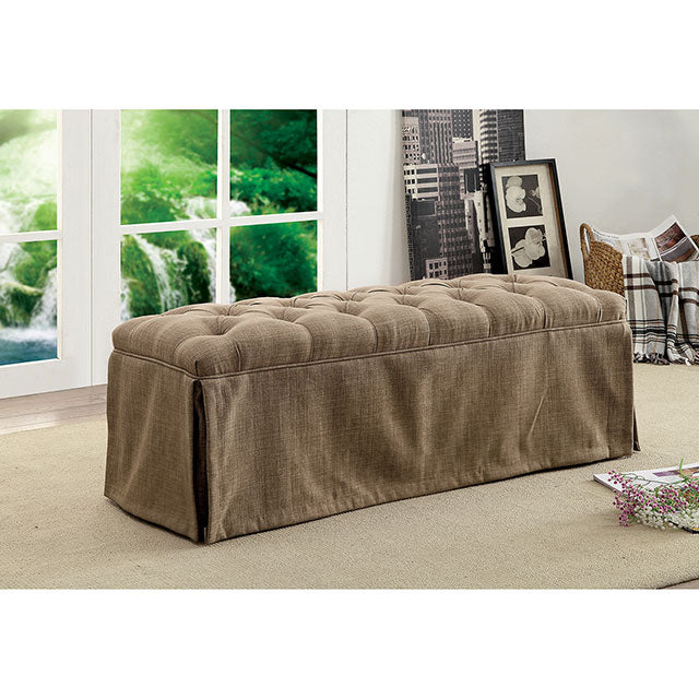 Touch up your space with this graceful transitional bench. Button tufted accents provide visual intrigue as they create billowing patterns along the roomy seat. Brush against the soft linen-like upholstery while the distinguished comfort of dense foam keeps you effortlessly supported. Available in multiple finishes.