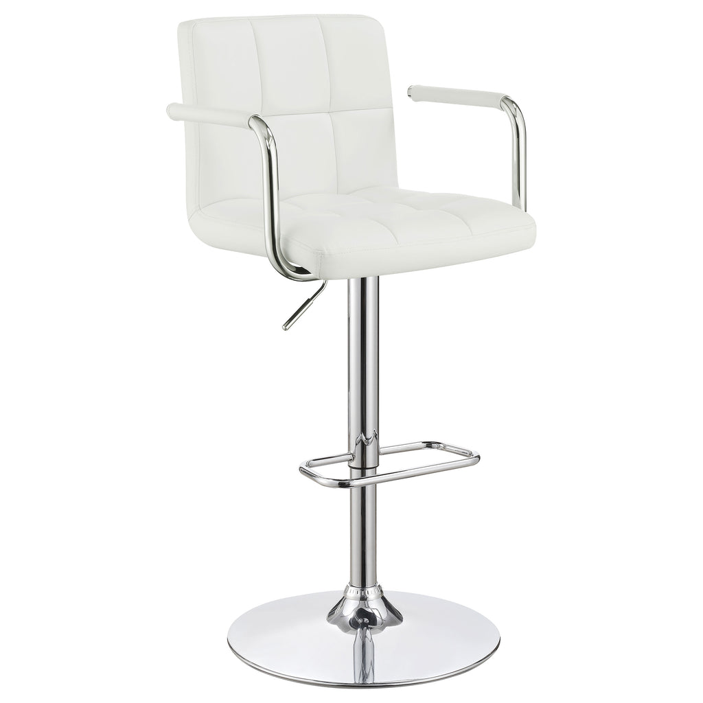 Upgrade your seating experience with this sleek hydraulic gas lift adjustable bar stool, perfect for modern kitchens or home bars. The stool features a cushioned seat with stylish tufting and a durable faux leather finish, providing both comfort and easy maintenance. Its adjustable height mechanism lets you find the perfect fit, while the chrome base and footrest add a polished, contemporary look. The integrated armrests offer added support, making it ideal for leisurely meals or casual gatherings. Enjoy both functionality and style with this versatile, high-quality bar stool. Key Features: • Hydraulic gas lift stool with adjustable height for customized comfort • Faux leather upholstery with tufted design adds a modern touch • Chrome base and footrest provide durability and sleek style • Integrated armrests for enhanced support and comfort • Perfect for kitchen islands, home bars, or entertainment spaces • Easy-to-clean surface for convenient maintenance
