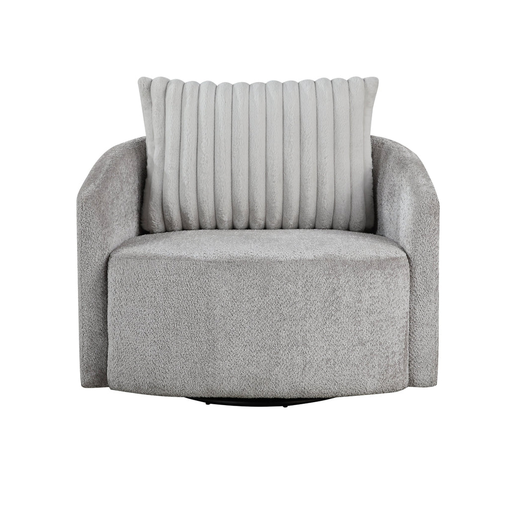 Enhance your living space with this spacious modern Francine Swivel Chair upholstered in soft gray chenille fabric, perfectly complemented by a plush corduroy back pillow for added texture and comfort. Designed for both style and versatility, this chair features a 360-degree swivel, allowing you to move with ease while enjoying ultimate relaxation. Ideal for living rooms, reading nooks, or home offices, this swivel chair combines sleek design with practical functionality.