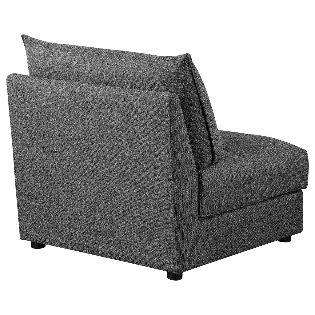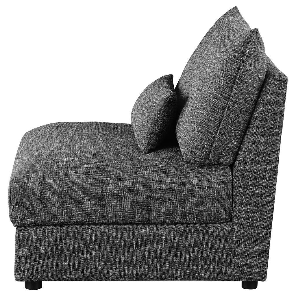Complete your living space with the refined look and elegant simplicity of a modern modular armless chair. Alone or in a larger configuration, it features plush feather blend and foam cushions with slightly textured upholstery for a sleek look and feel. The slipper-style chair is armless, great for a small space or adding length to a sofa. Barely black upholstery creates a sense of texture and depth while maintaining a neutral look for your living room. A lumbar pillow is included for added comfort and support.