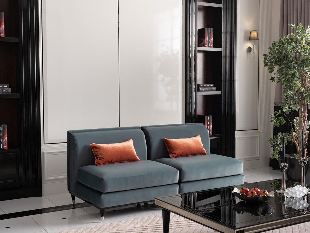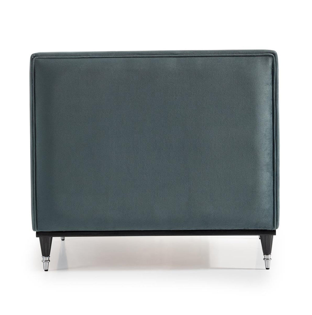 AICO La Francaise Armless Chair in Azure/Black LFR-FRSE830-AZR-805. Dressed in sumptuous azure blue velvet, this chic piece is accentuated by a single sunset velvet oblong pillow, adding a dash of warmth to its sophisticated charm. Whether you choose to create a larger seating area by pairing it with additional armless chairs or let it shine as a stand-alone statement piece in any room, this elegant chair offers boundless possibilities to elevate your space.