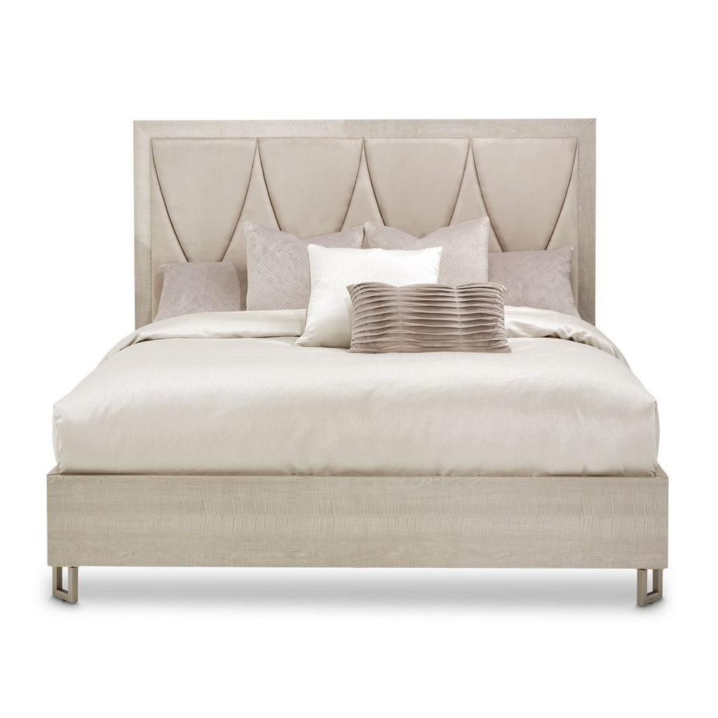 AICO Marin California King Panel Bed in Greige KI-MRQN-139. The perfect space for rest and relaxation. The Marin Bed has a panel headboard with an upholstered insert framed in Greige, and stainless steel finished feet that adds a touch of embellishment.
