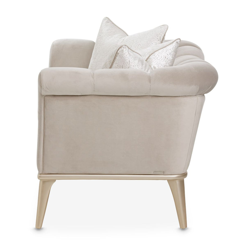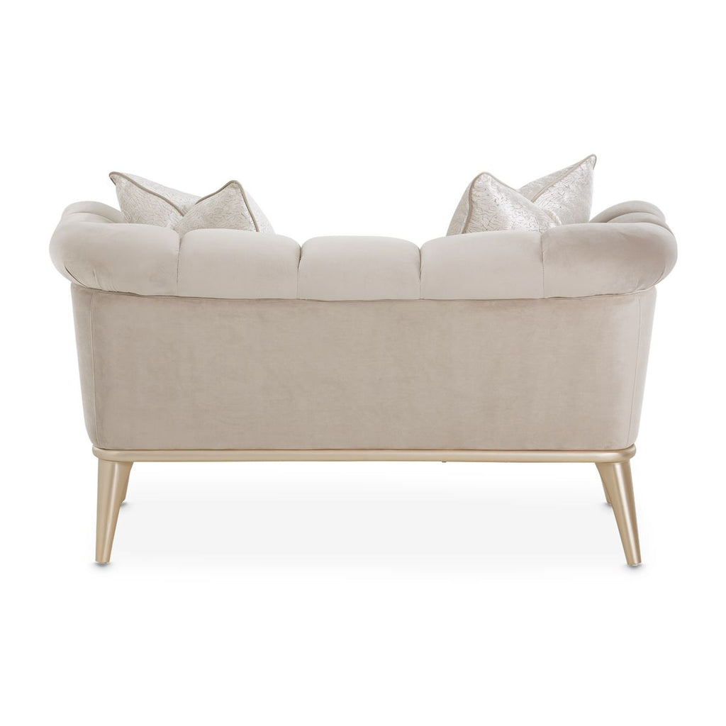 AICO Yvette Chair and A Half in Porcini Medium Champagne LRU-YVTE838-PCI-136. Yvette makes lounging look better than ever! Sink into velvet seats, relax against a glamorous flared silhouette, and let the painted brushed brass finish brighten your living space. Designed with chic neutrals and eye-catching shapes, this group is made with the best of timeless details.