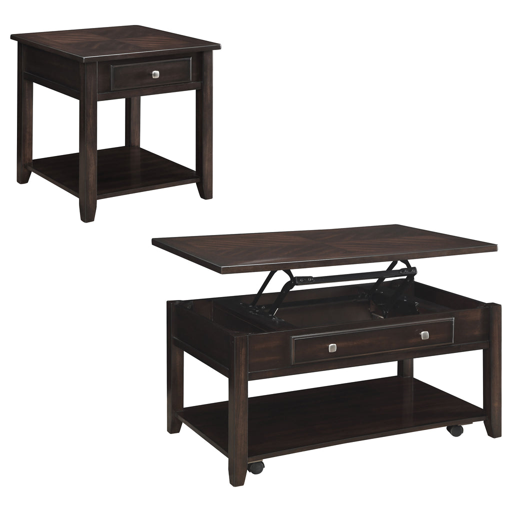 This coffee table set offers a perfect blend of timeless design and practical functionality. Each piece is crafted from poplar, plywood, and engineered wood with birch veneer, finished in a rich walnut hue for warmth and sophistication. The lift-top coffee table features a hidden storage compartment, lower shelf, and smooth casters for mobility. The end table includes a single drawer with nickel hardware and a lower shelf for added storage. Clean lines and transitional styling make this set a versatile addition to any living room.