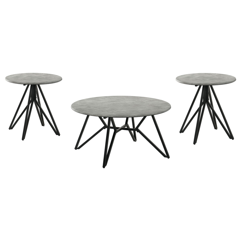 This modern coffee table set features a break-proof and shock-resistant faux cement top with a sandy texture, combining industrial style with practicality. The high-pressure laminate surfaces resist stains, UV light, scratches, and cigarette burns for exceptional durability. Gunmetal-finished metal bases with striking geometric designs provide stability and a sculptural aesthetic. Perfect for modern and minimalist interiors, this occasional table set adds functionality and style to your living space.
