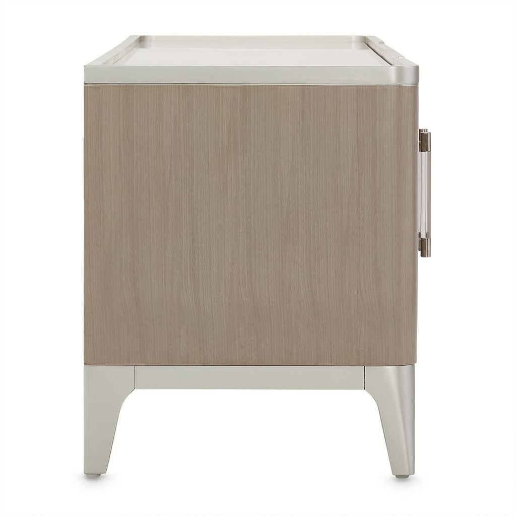 AICO Lanterna Media Cabinet in Silver Mist N9032081-823. Complete your modern living room with the Lanterna Media Cabinet! With a sleek marble top, platinum trim and the space for every media piece, you'll never feel more entertained.