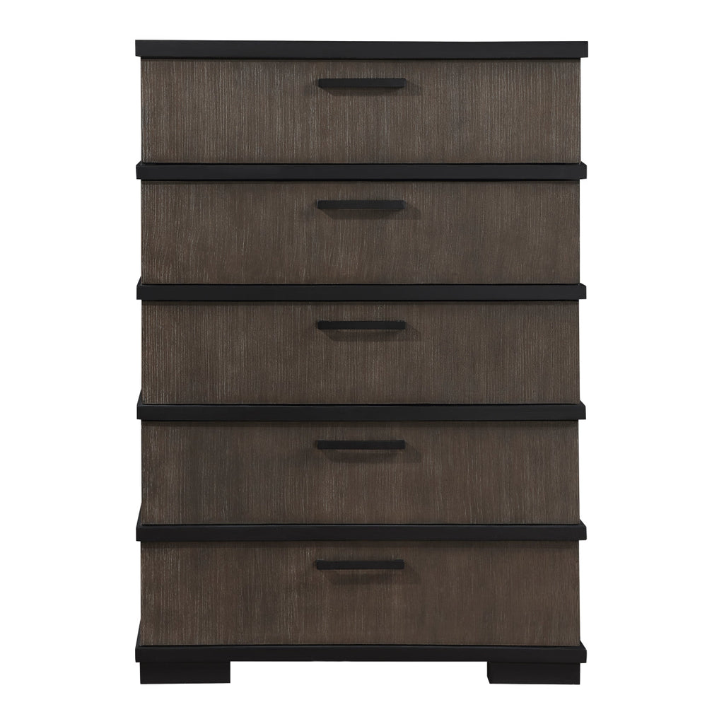 Modern lines pair with texture and hue to create the dynamic look of the Acworth Collection. The two-tone brown-ish gray and black finish over oak veneer of the collection lends to the modern-industrial inspired aesthetic that comprises the collection’s design. Black bar hardware fronts the drawers of the drawers of the chest, their minimalistic lines providing bold accent to the piece.