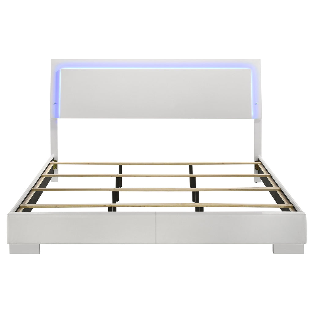 Illuminate your bedroom with the modern design of this LED bed. The headboard features a sleek white high gloss frame with built-in blue LED lighting, operated by a touch switch for convenience. The bed frame is upholstered in smooth white faux leather, enhancing its contemporary appeal. Designed for style and comfort, this bed brings a striking yet functional centerpiece to your space, blending modern aesthetics with subtle ambient lighting. Key Features: • Panel bed featuring a sleek, modern LED headboard design • White high gloss headboard frame with built-in blue LED lighting strip • Touch-activated switch provides effortless LED illumination control • Bed frame upholstered in smooth and durable white faux leather • Sturdy construction ensures lasting support and structural integrity • Contemporary design blends stylish aesthetics with ambient lighting effects
