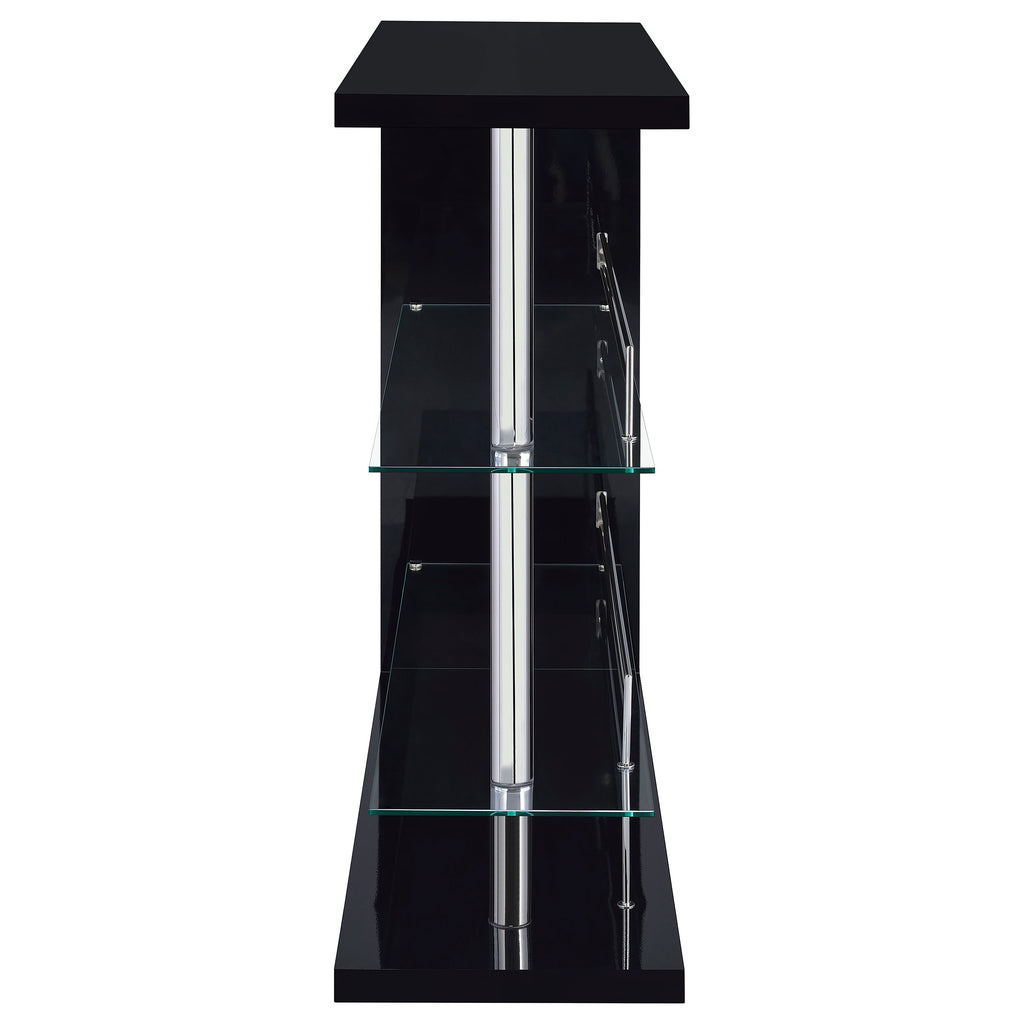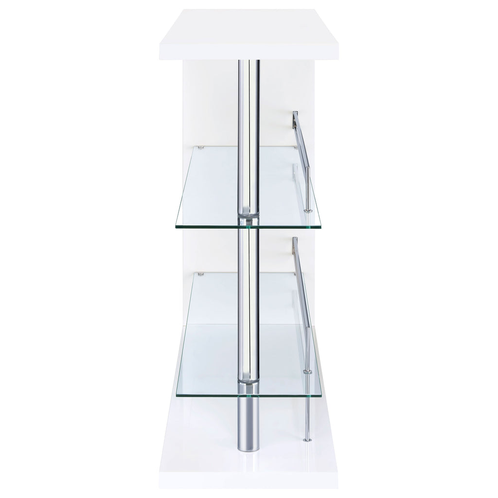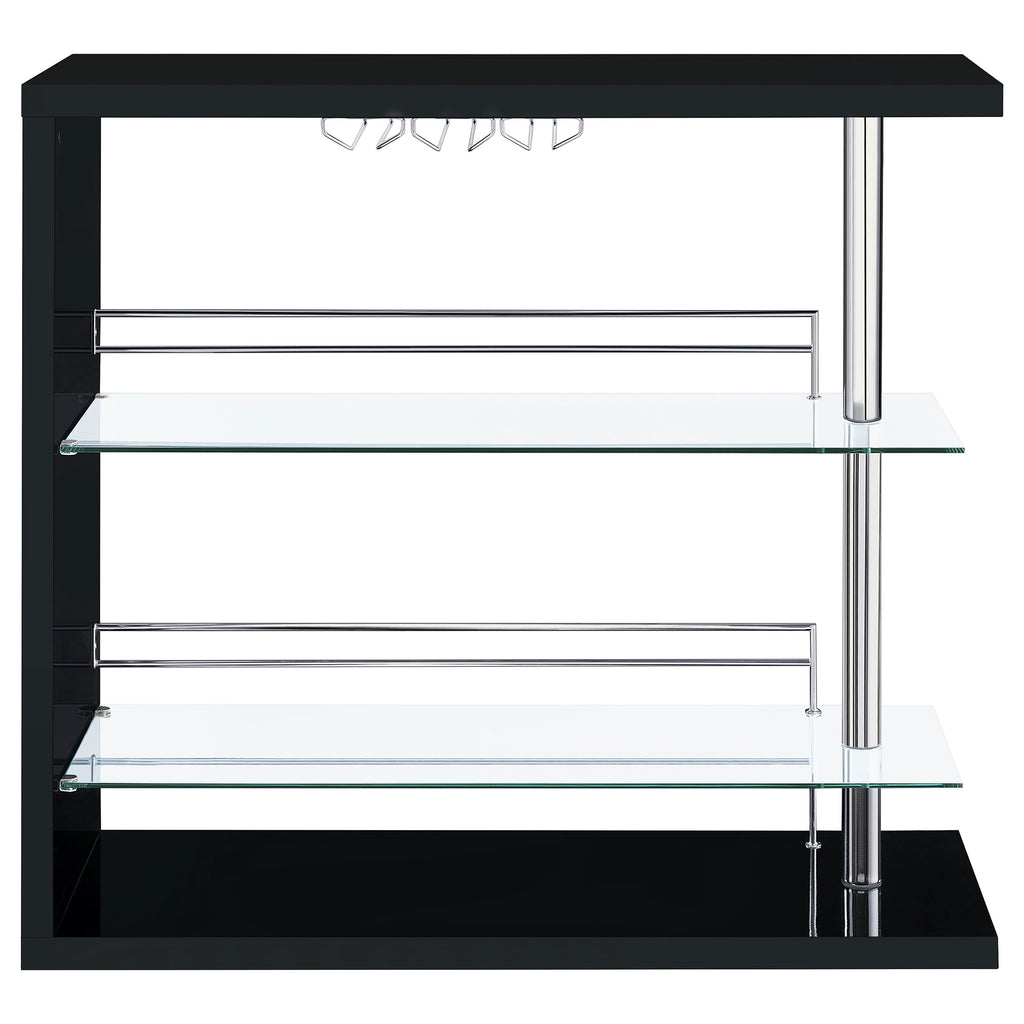 If you love to entertain, you'll love the charm and convenience of this fabulous, contemporary bar unit. With a sleek, stylish design, it looks elegant in a dining area or recreation room. Complete with a gorgeous gloss black finish and shining chrome accents, its bold silhouette makes a striking statement. This handsome unit includes two glass storage shelves for wine, glassware, and bar accessories. A handy wine glass holder rounds out its versatile appeal. Key Features: • Smaller footprint makes this contemporary bar unit a hit • Elegant, clear tempered glass shelves provide strength • Two (2) glass shelves with guardrails and stemware racks add storage and protect the stored items • Steel, MDF, particle board, and laminate construction • Choose from glossy black, glossy cappuccino, glossy white, or weathered grey