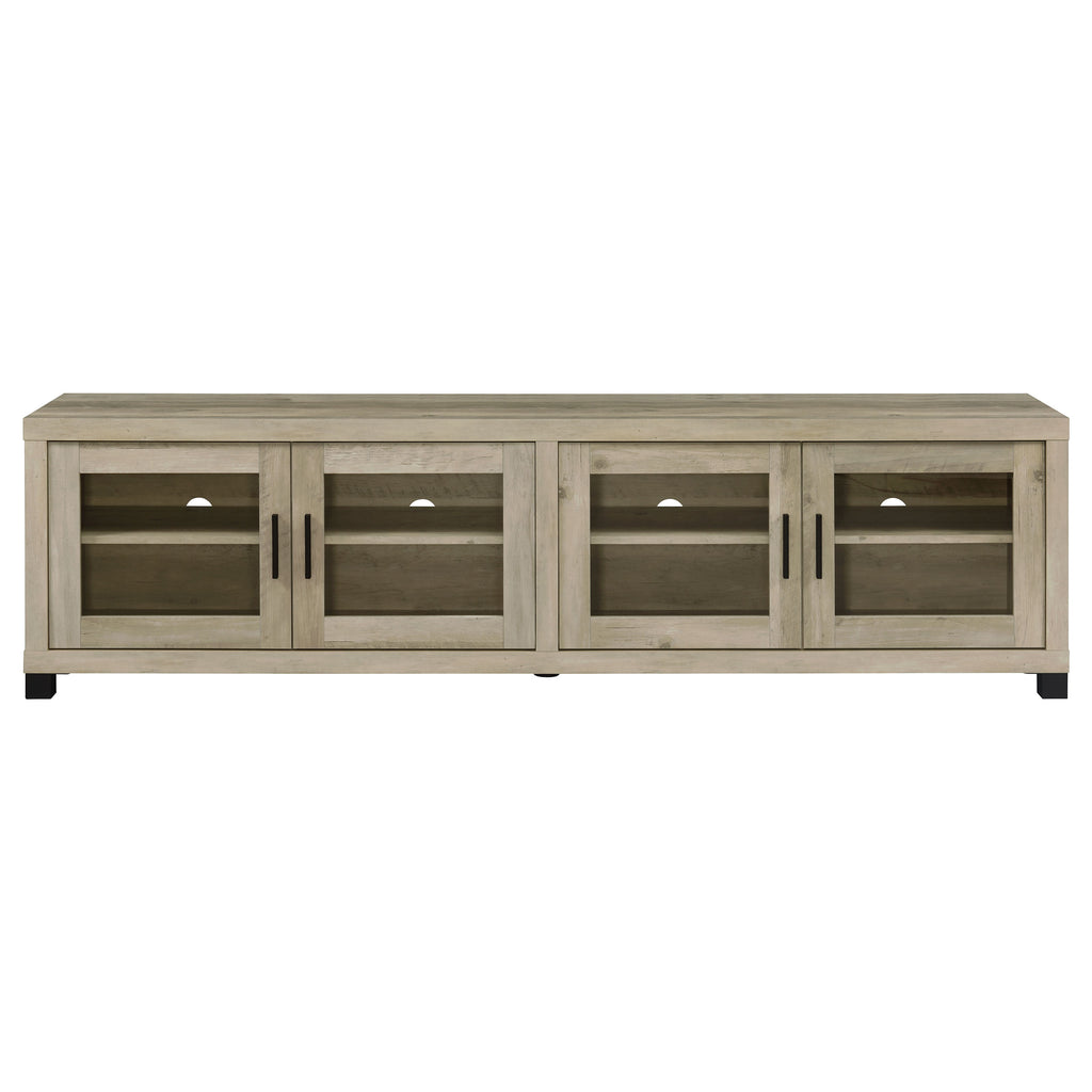 Upgrade your entertainment space with this 79-inch TV stand, featuring a contemporary boxy silhouette and smooth surfaces. The distressed pine finish enhances its rustic appeal, while the glass-paneled cabinet doors add a refined touch. Adjustable shelves provide customizable storage for media devices, gaming consoles, and décor. The spacious tabletop supports TVs up to 85 inches, making it ideal for both stand-alone and wall-mounted configurations. Black metal legs and sleek black handles create a bold contrast, offering an industrial-inspired accent to any modern or farmhouse-style home. Key Features: • Modern 79-inch TV stand with sleek glass doors for a sophisticated touch • Distressed pine wood finish brings rustic warmth to contemporary spaces • Adjustable shelves offer flexible storage for electronics and accessories • Engineered wood and metal construction ensures long-lasting durability • Supports TVs up to 85 inches, perfect for large entertainment setups • Black metal legs and handles enhance the industrial-chic aesthetic