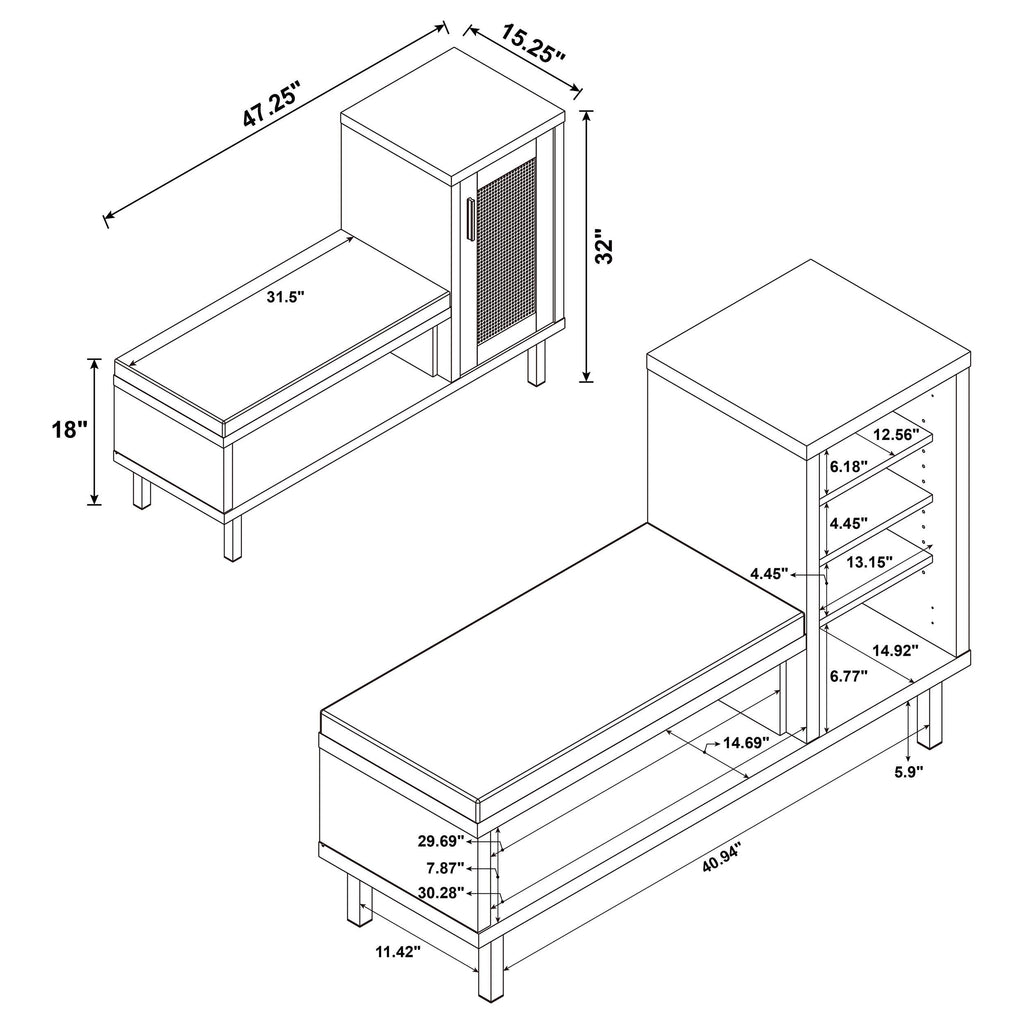 Elevate your entryway with this multifunctional shoe storage bench, elegantly merging form and function. Its engineered wood frame is finished with a durable natural oak colored wood-look laminate veneer, while a black faux leather cushion, foam-padded for comfort, tops the seating area. On one side, a cane-style metal panel door opens to reveal four tiers of shelving, neatly organizing your footwear. Supported by black powder-coated metal legs, this versatile piece delivers both style and practicality in one refined package.