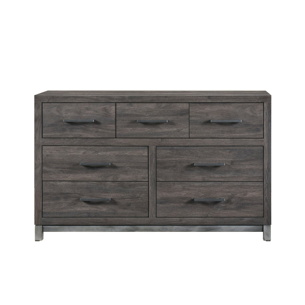 The sleek design of the Zephyr Collection pairs clean lines with modern convenience to create a style that will be the perfect palette for your design aspirations. Visually tying the dresser together are the painted metal-finish banding of the base rail and the metal bar hardware that fronts each drawer, culminating in an accenting contrast to the dark gray faux wood finish of the melamine veneer.
