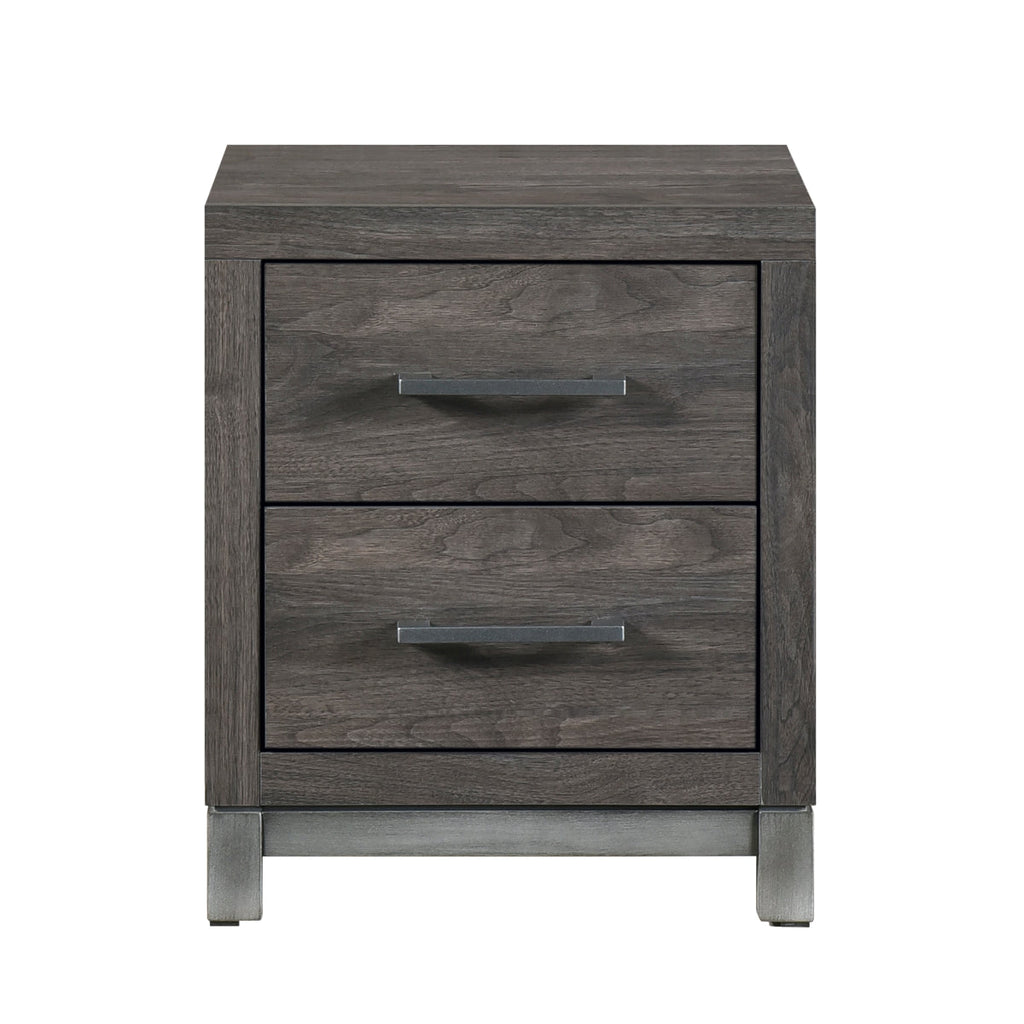 The sleek design of the Zephyr Collection pairs clean lines with modern convenience to create a style that will be the perfect palette for your design aspirations. Visually tying the nightstand together are the painted metal-finish banding of the base rail and the metal bar hardware that fronts each drawer, culminating in an accenting contrast to the dark gray faux wood finish of the melamine veneer.