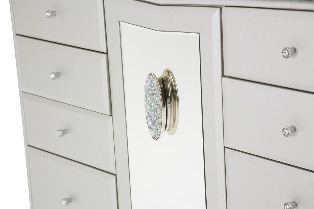 • Door and drawer pulls have decorative crystal inserts.