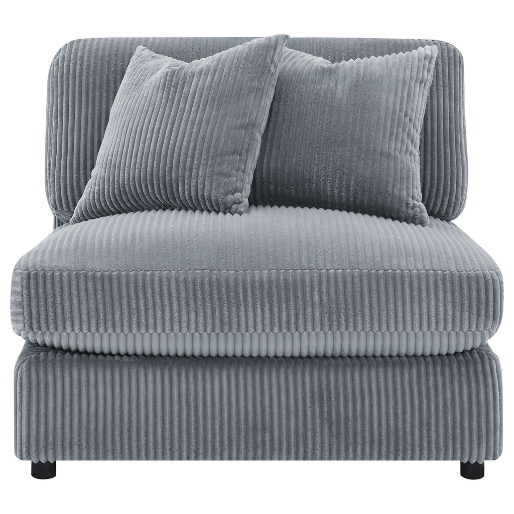 Instill cozy and inviting energy in your den or living room with a modern armless chair. Plush and comfortable, it features soft cushions and wide wale corduroy style upholstery in a soft neutral hue, perfect for augmenting existing seating. The seat and back cushions are each reversible, adding versatility and perfect for families and entertaining. Feet include non-skid grip to help keep the chair just where you place it within your space. Group couple by the fire, or add a cozy spot for reading and relaxing to your home office. Key Features: • Fully upholstered armless chair functions as a standalone or modular piece • Sand corduroy upholstery offers a soft, textured feel • Plush cushioning provides exceptional comfort and support • Loose back pillows allow for customizable relaxation • Wide seat design enhances lounging space and coziness • Sturdy construction ensures lasting durability