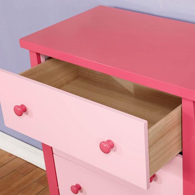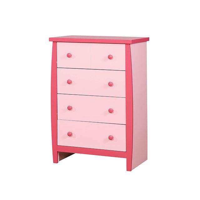 Add a contemporary flair to your kid's room with this stunning two tone bedroom chest. The curving sides and round drawer pulls give this bedroom set a modern look without becoming overtly complex or introducing different materials. This five drawer chest stands tall but sits sturdy on flat side feet.