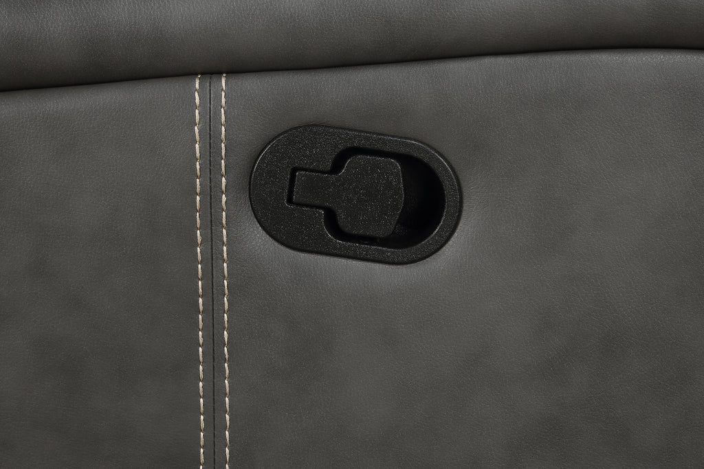 Merging the classic style of both contemporary and transitional design schemes, the three-piece sofa, loveseat, and recliner set create a dreamy venue for relaxing. The trending look of smooth grey leatherette upholstery with vertical topstitching delivers decorative elements and a dimensional impact. This motion-reclining set features foam padding on its frames and pocket coil spring seat cushions, as attached back cushions are capped with ultra-plump headrests. Recline into varying positions using a manual control function, and enjoy space efficiency with its wall-hugger design. Bonus features include a center-mounted loveseat console with a flip-top storage bin and a pair of handy beverage holders.