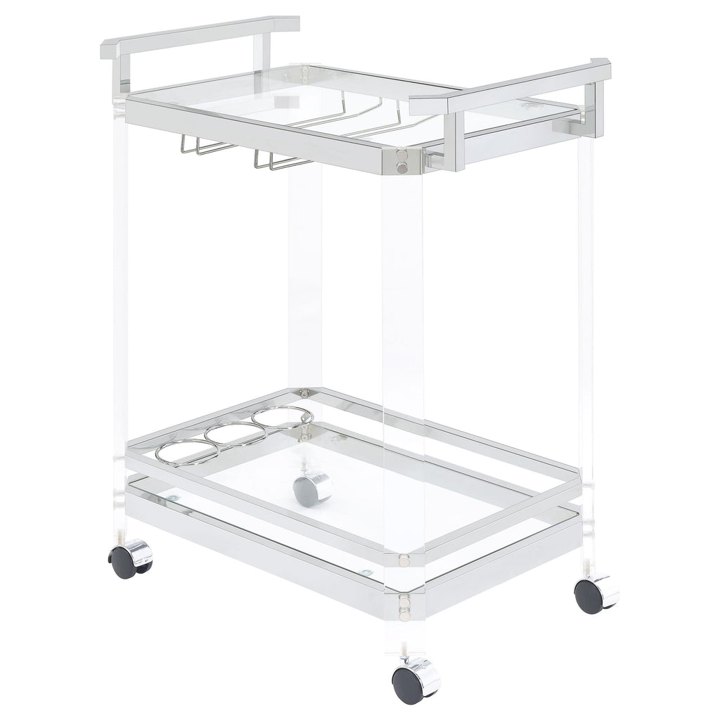 A serving cart is a delightful accoutrement for any home bar or indoor patio. This serving cart takes it to another level with an acrylic and metal frame finished in chrome. It features clear tempered glass shelves that's simple yet modern. Bottom shelf features wine bottle holders while top shelf features a stemware rack underneath. With convenient wheels, take this serving cart wherever drinks are in demand.