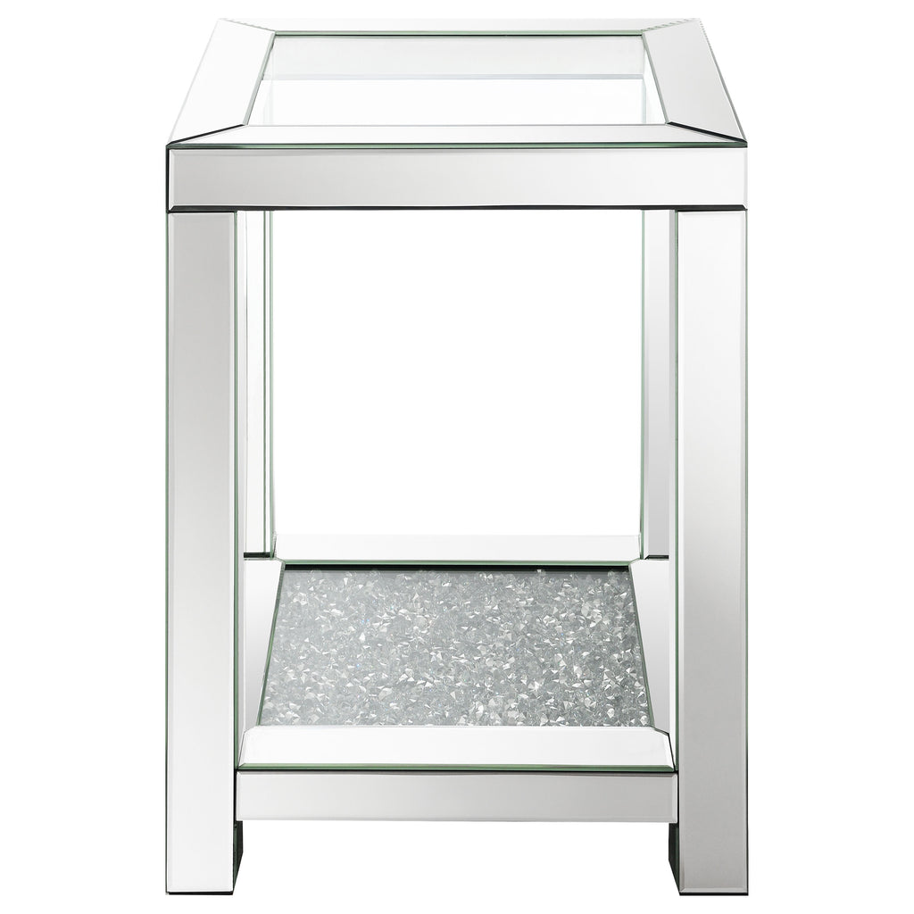 Transform your living space with this glam mirrored coffee table set. Featuring mirrored frames with beveled mirror trim and tempered clear glass tops, these pieces exude modern flair and Hollywood Regency vibes. The sparkling acrylic jewel-encrusted bottom shelves add a dazzling touch, while the mirror tile accents elevate their chic, refined design. Perfect for glamorous interiors, this set offers a blend of luxury and functionality.