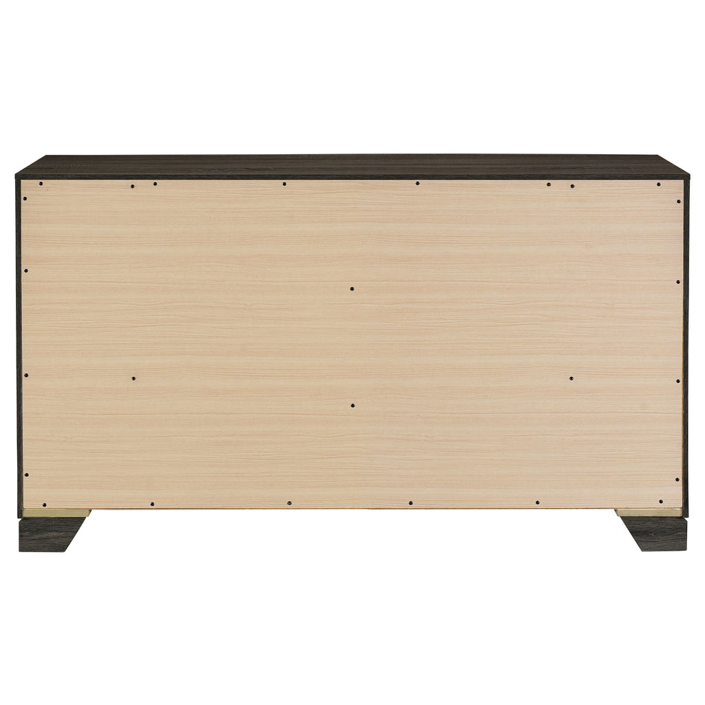 Introduce gracious style in an approachable, tailored bedroom suite with this transitional six-drawer dresser. Designed to augment clothing and accessory storage, it's built with six roomy drawers, all complete with center metal glides for smooth performance. Its exterior features engineered wood and laminate construction, creating durability and reliability. Its case is encased in mitered trim and stands on singular block legs, adding a sense of precision and character. Bar handles complete the stylish look while its wide top allows for a curated selection of decor brings a personal touch.